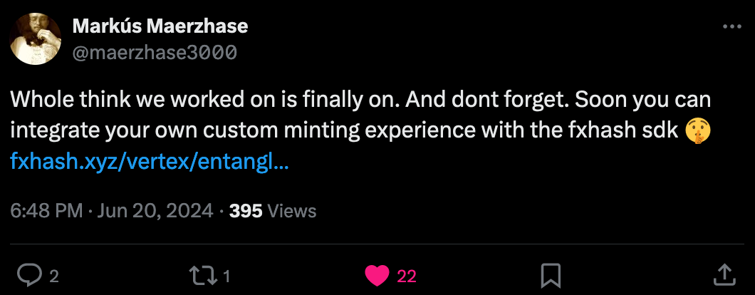 And apparently there's more to fxhash's new Vertex platform than I had assumed the first time round: it seems that we'll also get some new features in the fxhash sdk that'll allow artists to create their own custom minting experiences. I'm assuming it'll be a set of tools to create generative tokens that have the ability to interact with each other in some way just like Bjorn's Entangled does: