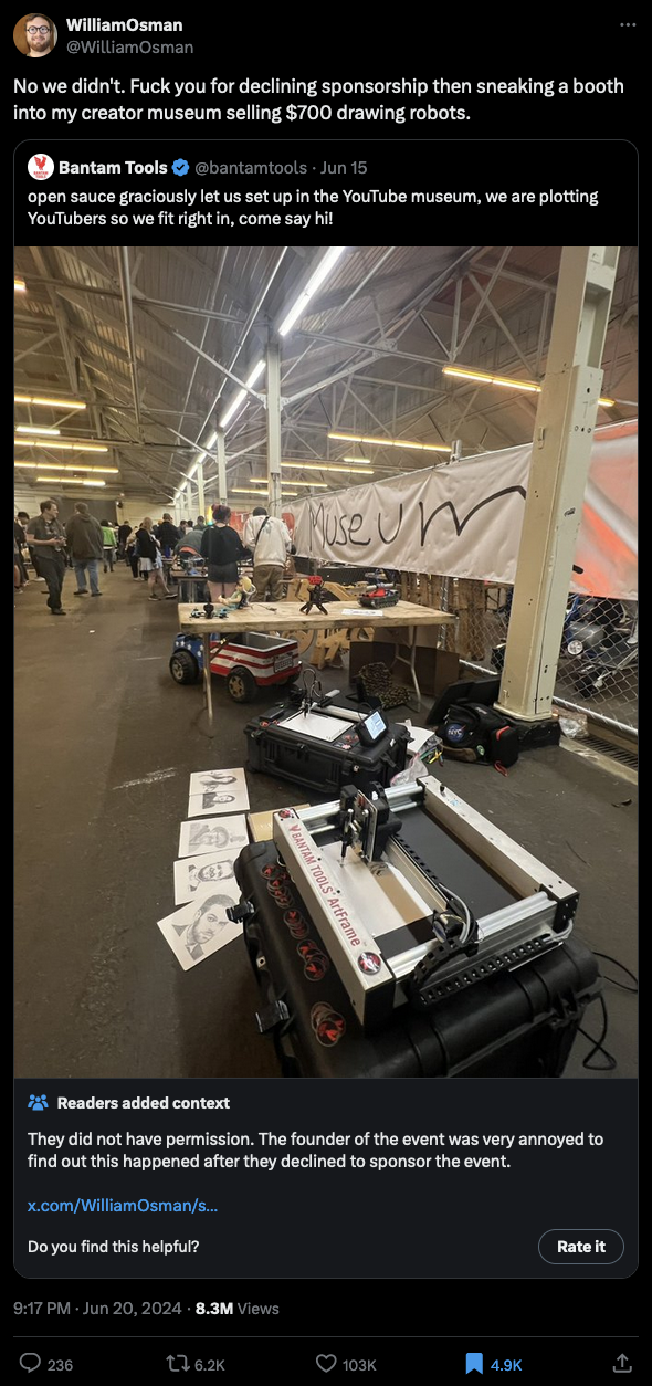 Beyond that, there also seems to have been some sort of drama revolving around Bantam Tools (the company that acquired Evil Mad Scientist earlier this year, the creators of the AxiDraw) setting up an improptu booth at the Open Sauce venue, which in turn prompted a pretty harsh response from the founder of the event William Osman, stemming from the fact that Bantam Tools had originally declined sponsoring the event. Osman's tweet now sits at around 100k likes on Twitter, which is kind of bonkers: