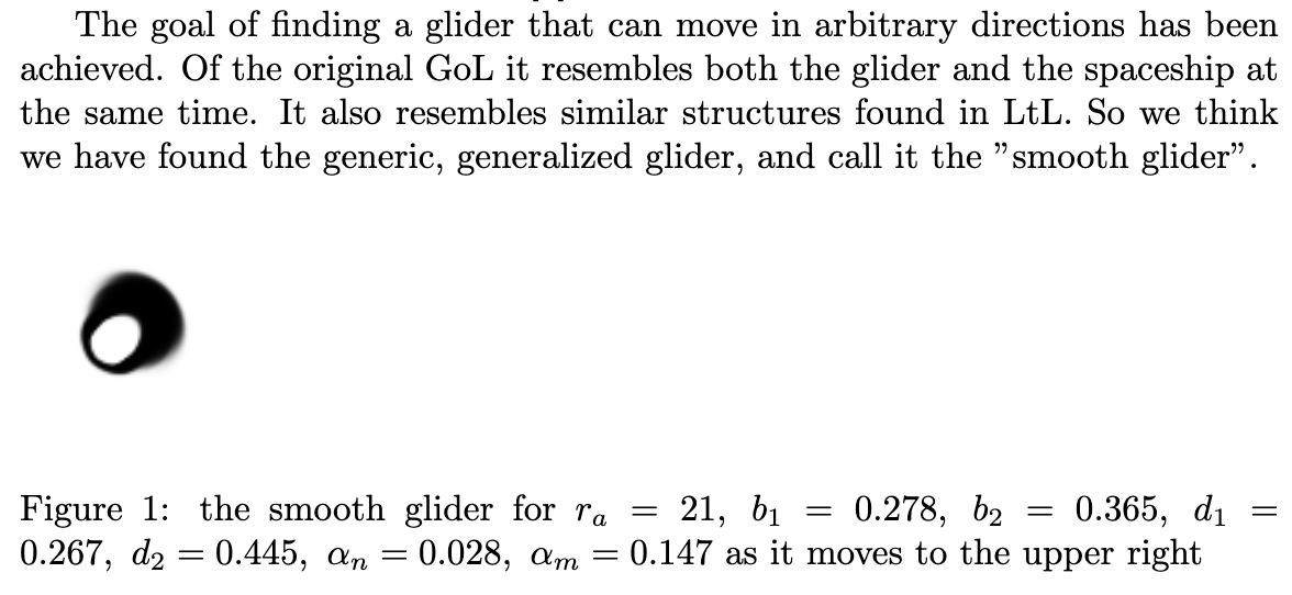 Due to this continuous nature, the emergent patterns are seemingly more complex, more dynamic, less pixelated, and resembling natural phenomena such as fluid flows, waves, and the motion of biological organisms. It also exhibits behaviors not seen in Conway's Game of Life, such as gliders that can travel in any direction as well as structures that resemble elastic cords.