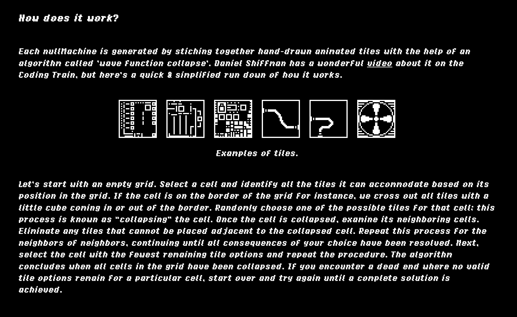 To cap off the Web3 news this week, I wanted to share another stellar project that's releasing next month; a collab between the two monochrome pixel junkies loackme and Kerim Safa titled Null Machines, putting a generative twist on Kerim Safa's trademark conveyor belts. They've set up a dedicated project page that tells a little but more about the project and how the tiny mesmerizing machines come to life, even share the recipe that aligns the animated tiles into a looping whole:
