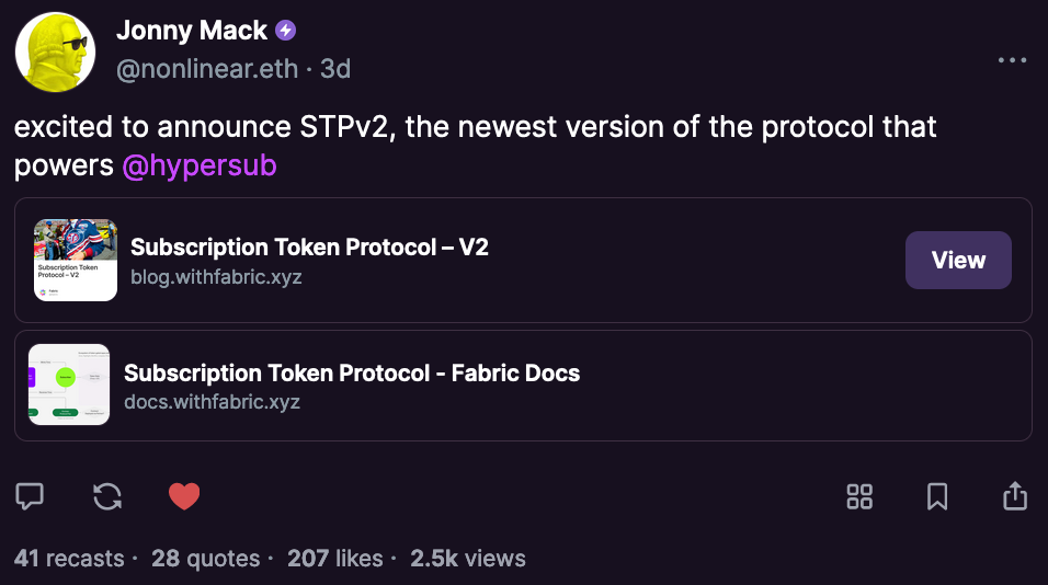 Secondly, the protocol's recently also gotten an upgrade that gives creators a couple of new options in how they can configure their onchain subscipritions - for instance it's now possible to have different subscription tiers. If you offer a subscription token via Hypersub it'll ask you to migrate your current subscribers to the V2 contract the next time you visit your dashboard - the announcement: