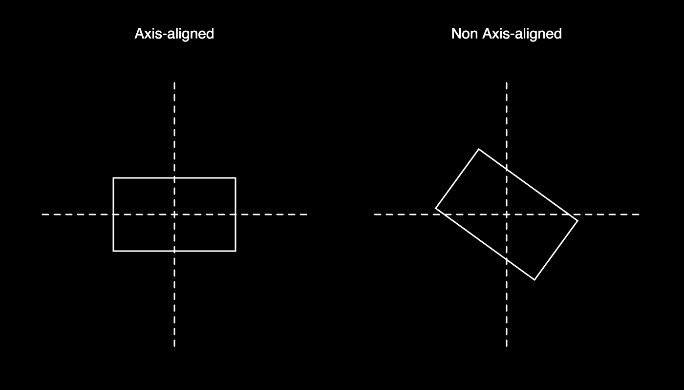 The term axis-aligned indicates that a shape is aligned with the coordinate axes. For example an axis-aligned rectangle would have it's edges parallel to the x and y axes. Something that isn't axis aligned can occur with a different orientation such that it lies rotated with respect to the coordinate axes. Here's an example: