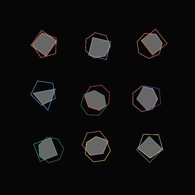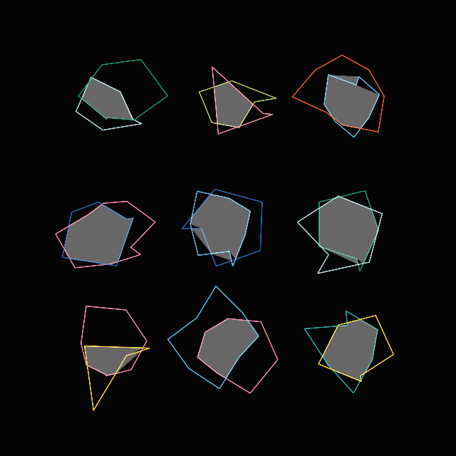 But essentially the only difference is that our makeRect() class becomes a makePoly() class, where the constructor accepts as input a list of vertices. How you create this list of vertices is up to you, because there is no single method to create various kinds of polygons. The example above showcases the intersection of different N-gons.