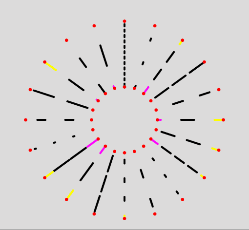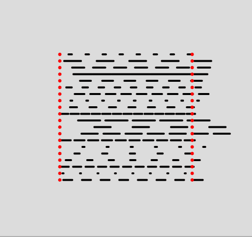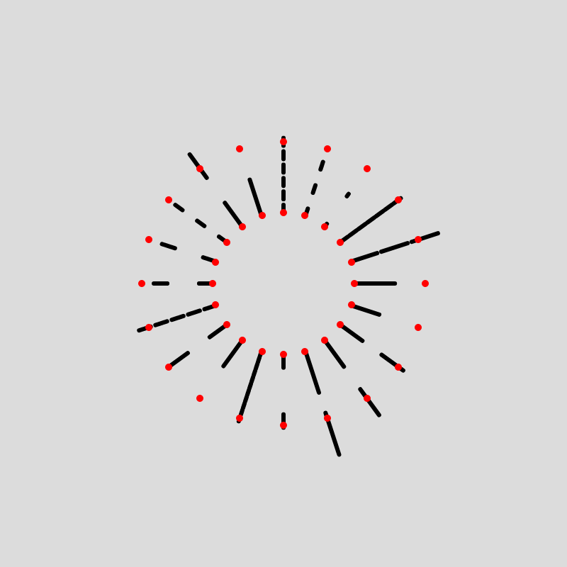Here we're actually drawing a couple of lines with the dash length and in-between spacing randomized. The red points show where the line starts and where it should end. You can see that in some cases the last dash protrudes further than the second red dot. My OCD thinks that this looks very bad and that this needs to be fixed. Let's also see what it looks like if we spread these lines on an arc or around a circle: