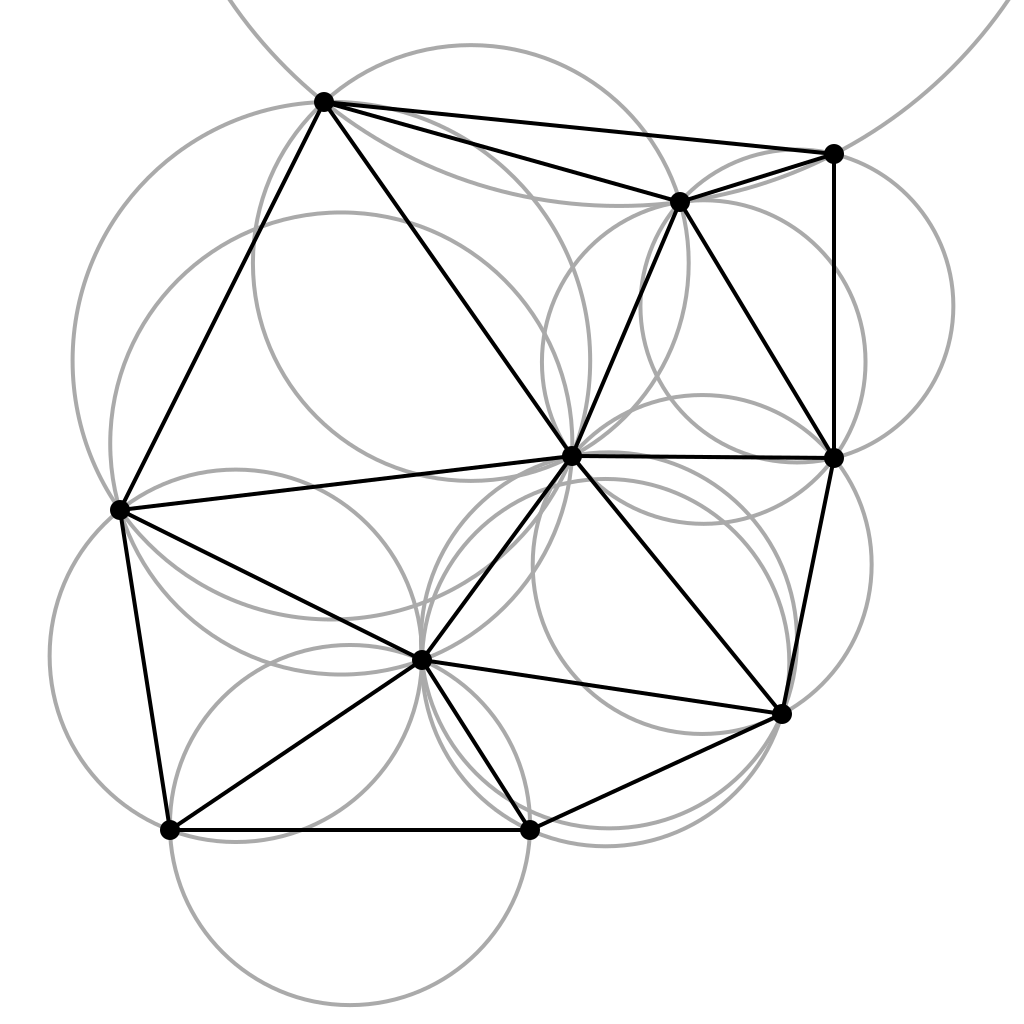 In other words, given a set of points, we need to draw edges between these points in such a manner that a triangular mesh emerges. None of the initial points are allowed to be contained within the diameter of any circumcircle of the triangles that make up this mesh. Ultimately, all points should lie on these circumcircles, where the circumcircle is the circle centered at the circumcenter of a triangle, which is a point that is equidistant from all three vertices of the triangle.