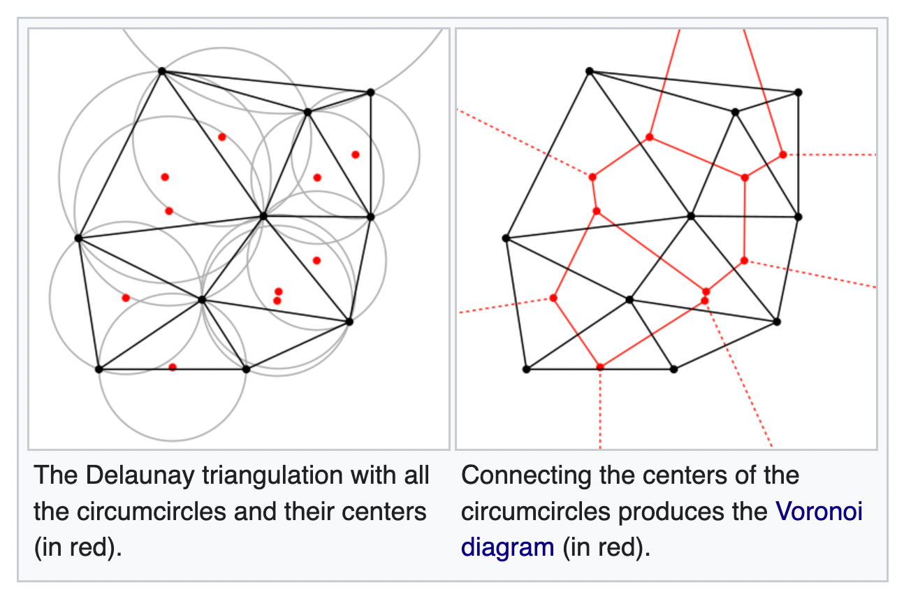 I really recommend reading at the least the first two sections of the paper as it draws a beautiful picture of how both Delaunay triangulations and Voronoi diagrams were discovered and re-discovered over the years, in addition to some interesting anecdotes and stories around the people that explored this field of mathematics. Unsurprisingly Voronoi was actually a friend of Delone's (Boris Delaunay) father, which had a big influence on his later work and can be inferred from the title of his 1934 paper 'Sur la sphere vide. A la memoire de Georges Voronoi.' (French for: On the empty Sphere. In memory of Georges Voronoi.)