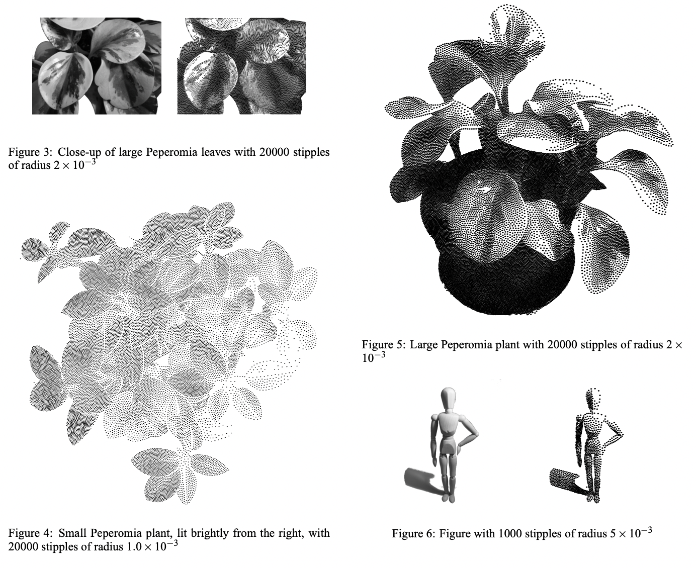 Stippling is the creation of a pattern simulating varying degrees of solidity or shading by using small dots. And it turns out that Voronoi diagrams can be used to achieve this effect, turning a given source image into one that is made out of many dots. I think that at this point it's clear, that spending some time with Delaunay triangulations and all the related topics is a worthwhile endeavour for creating interesting artworks.