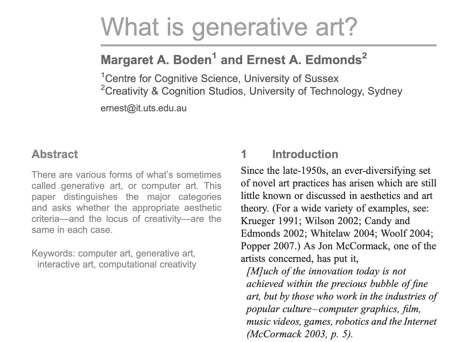 Ernest Edmonds points to a paper that I hadn't previously seen, co-written by him alongside Margaret E. Boden titled 'What is Generative Art?':