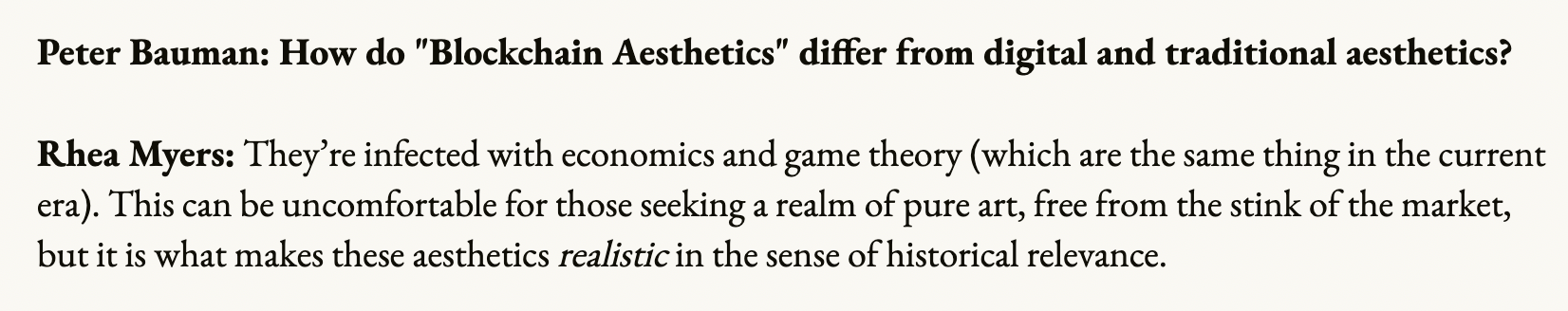 Rhea Myers' work lies at the intersection of culture and technology. She has found an interest in the blockchain as a cultural medium very early on: