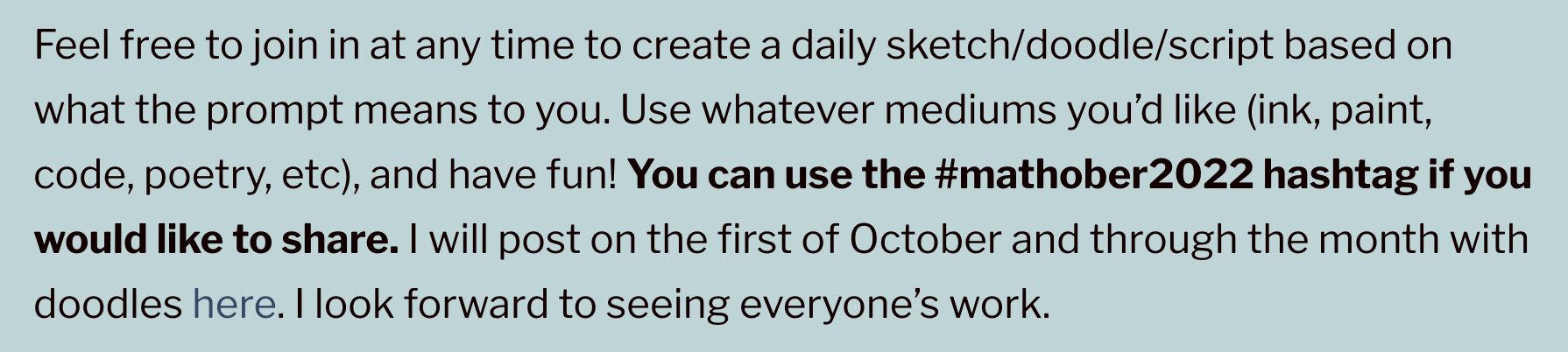 The Mathober prompts are selected by Sophia Wood aka Fractal Kitty, and can be found on her webpage: