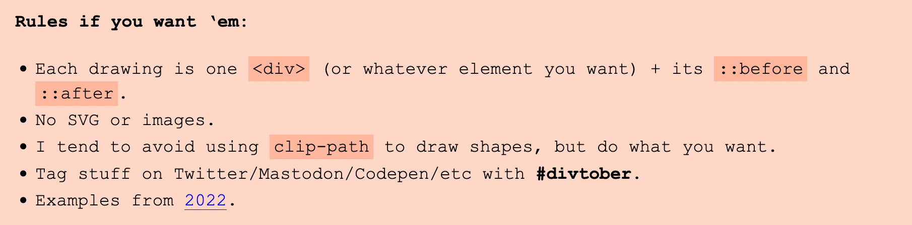 Divtober actually seems a little more daunting than Mathober, because the prompts are intended to be interpreted in form of a single CSS div - I have no idea how - but I think a lot of it has to do with the ::before and ::after pseudo elements: