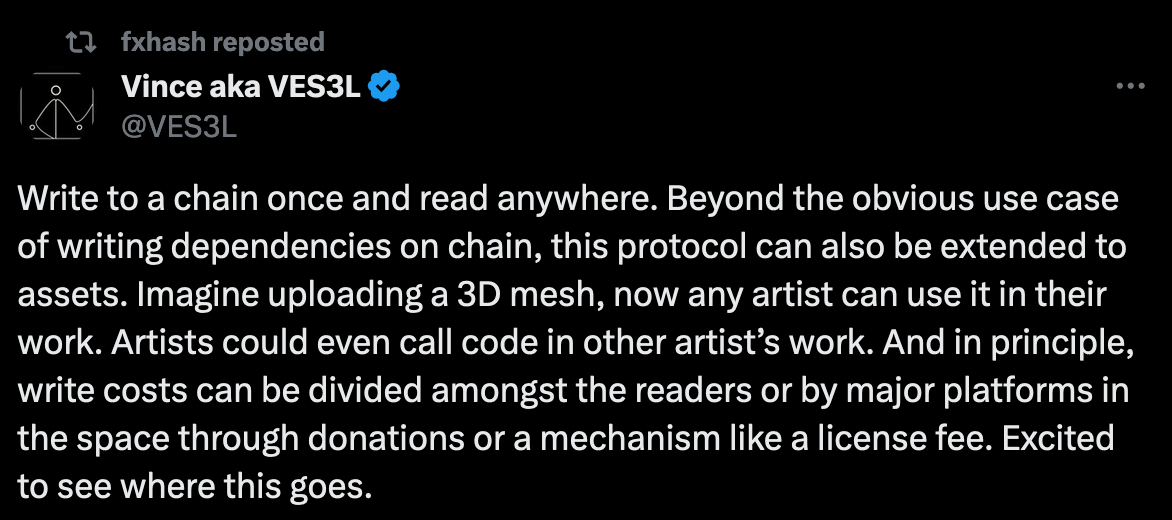 What's so cool about an on-chain file system? It opens up so many new possibilities and creative ways to make generative tokens on fxhash. Although both are decentralized methods of storing files, the immediate first improvement over IPFS is that you no longer have to worry about pinning your files to ensure that they're available in the future - by virtue of being written to the blockchain they're essentially always pinned.