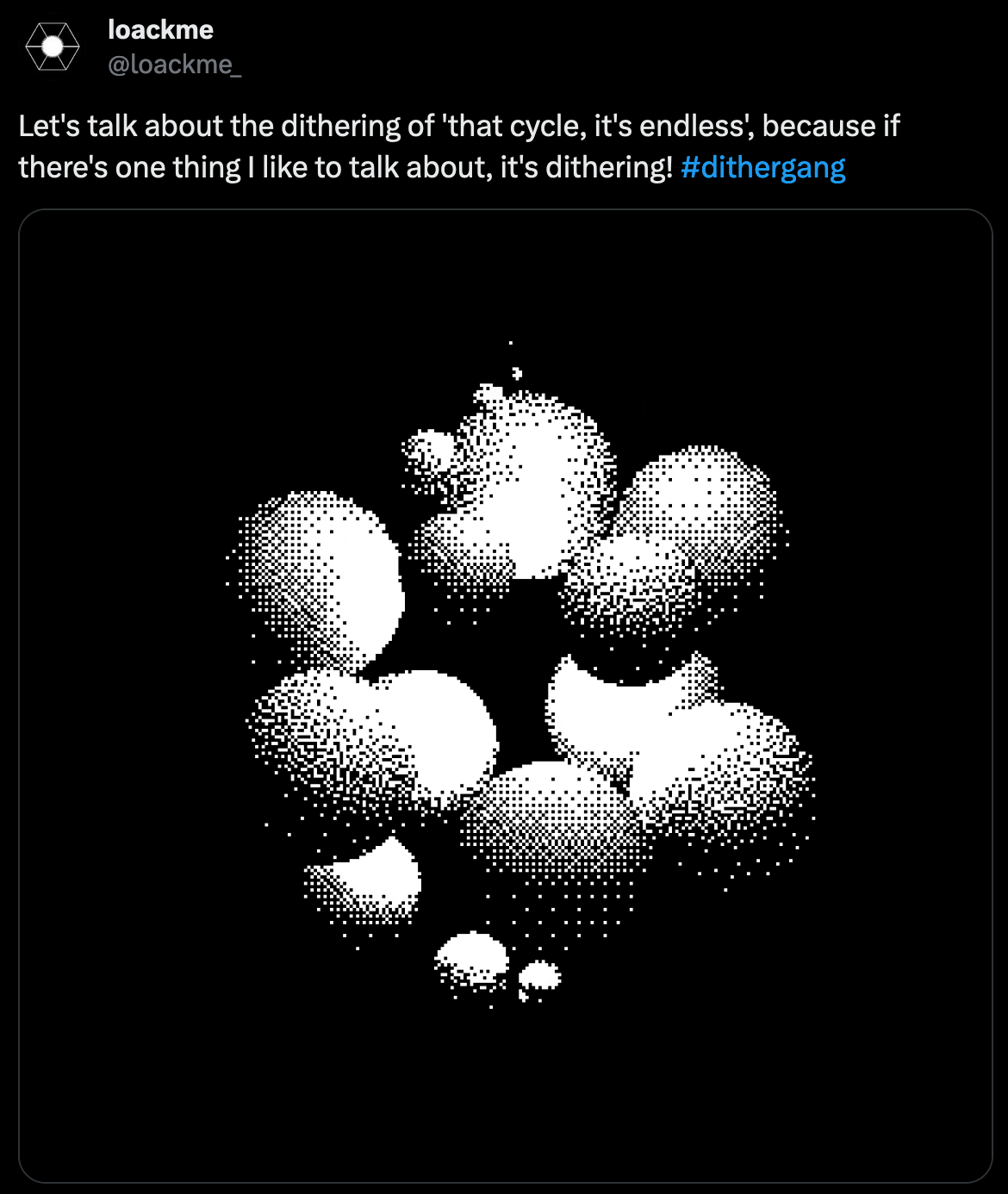 He recently released a stunning piece on Foundation titled 'that cycle, it's endless'. At first glance it might just seem like a couple of spheres rotating around a central point, but a closer look will reveal that the shadowy spheres are subject to a different kinds of dithering. Loackme talks about how it's achieved in this thread of his: