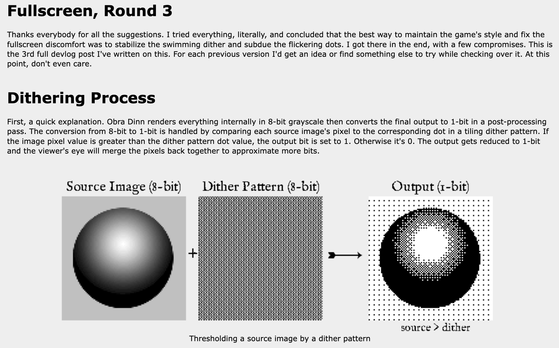 He also mentions that the idea was inspired by a game titled Return of the Obra Dinn (it's been on my to-play list for way too long now) - it's from the same creator of the stellar indie game Paper Please, Lucas Pope. Digging a bit further into the topic, I found this thread from 2017 in which Lukas documented his approach to dithering during the development of the game: