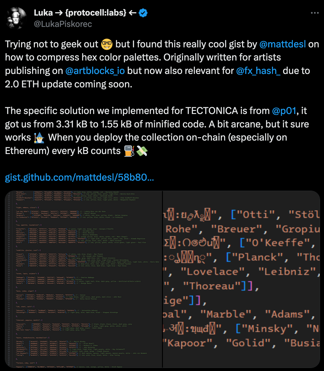 With fxhash 2.0 coming up, and with many artists opting to mint their projects onchain with fxhas's new On-Chain File System (ONCHFS), code compression is becoming a much more important topic where gas fees for onchain-ing a project essentially depend on the size of the code files.