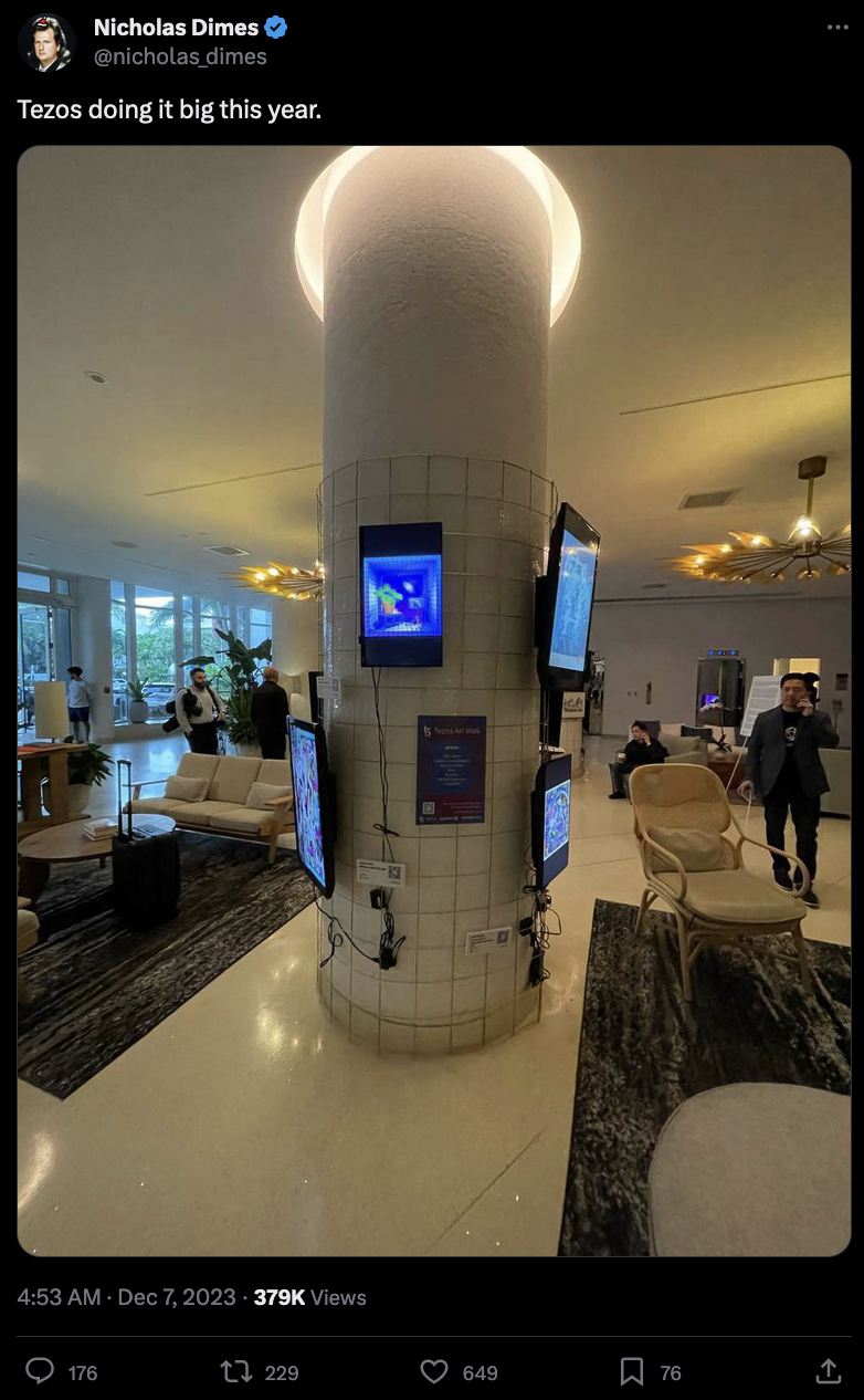 In the unlikely event that you haven't seen it yet - this pic from the Tezos showcase of some artworks at the Miami Art Week made the rounds over on TwitterX, leading to a couple of interesting developments: