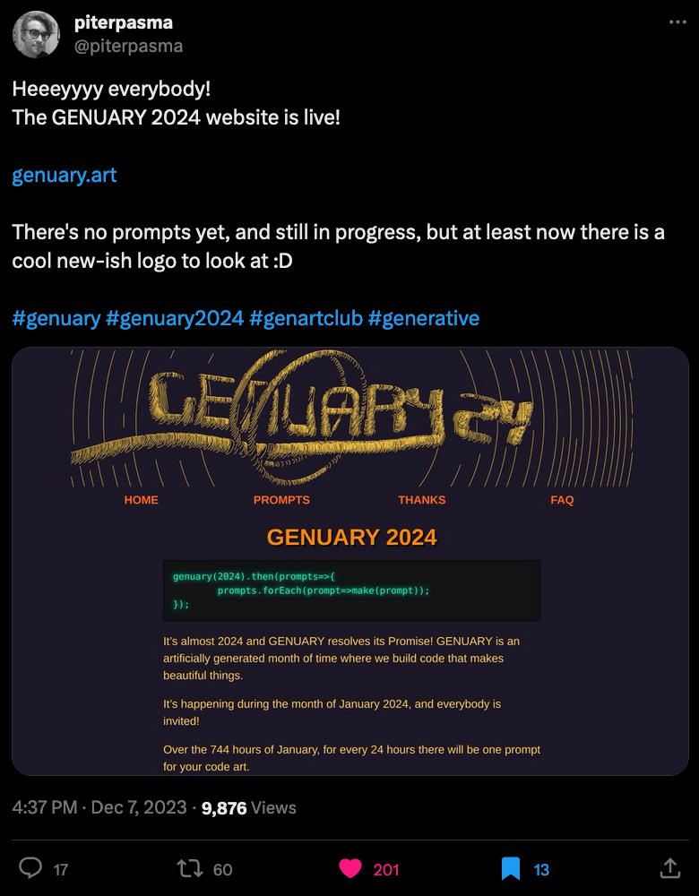 As we're getting closer to wrapping up this year, Genuary is already knocking on the doors for a month-long bonanza of generative shenanigans - Piter Pasma announced last week that the official website is already up: