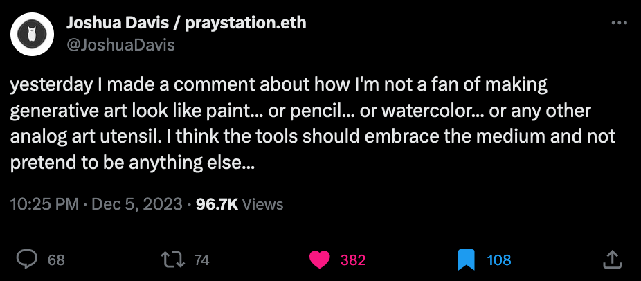 The discourse around skeuomorphism in generative art has been a recurring conversation in the space, and again, things heated up to some degree over the past week. This time, the conversation escalated following this tweet from the generative OG Joshua Davis:
