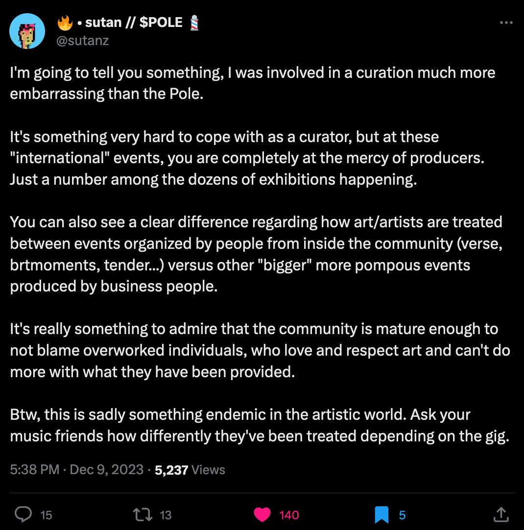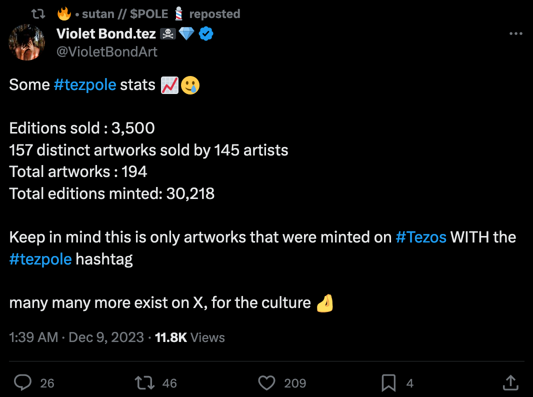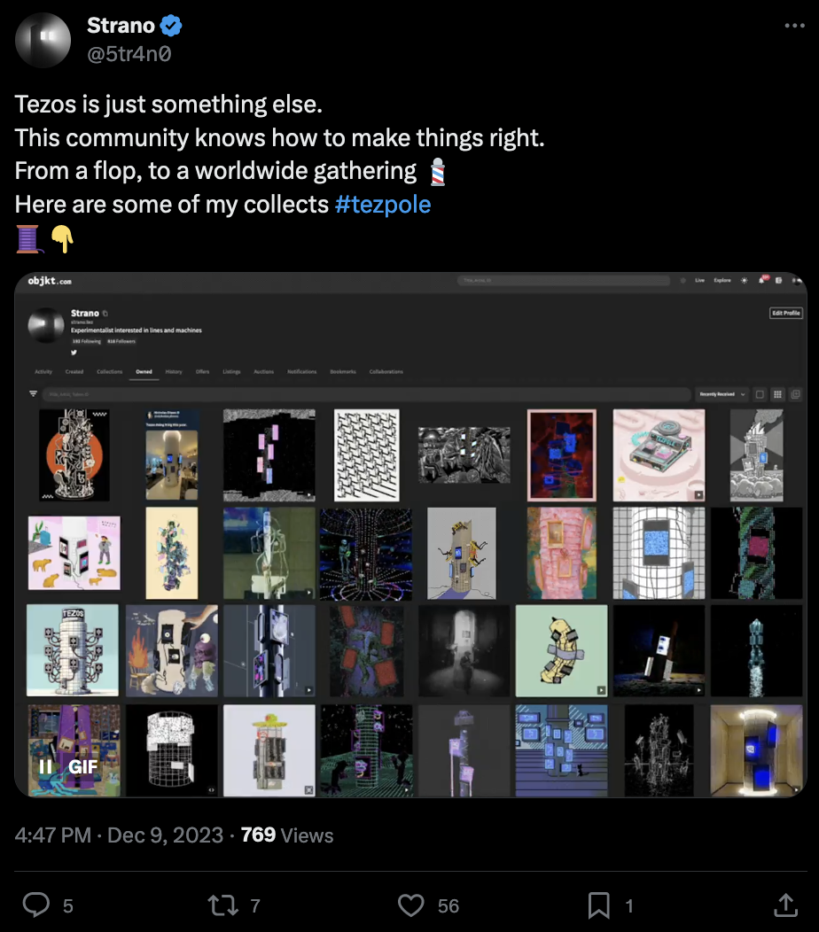 Many pointed out the irony of it all, the tezpole being representative of how much the Tezos foundation cares about the art community that rose to existence in the 2021 HEN days. In the chaos that ensued on TwitterX the picture quickly turned into an internet sensation, with many artists making Tezpole inspired artworks, launching into an improptu Tezpole event. Strano made a lovely thread about some of the creations: