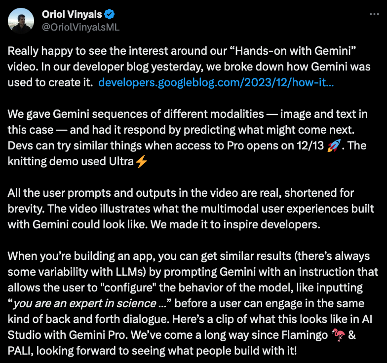 It seems that we can't catch a break from drama in the AI space. A couple of days ago Google announced their newest AI model called Gemini with a trailer that just seemed a bit too good to be true - have a look for yourself: