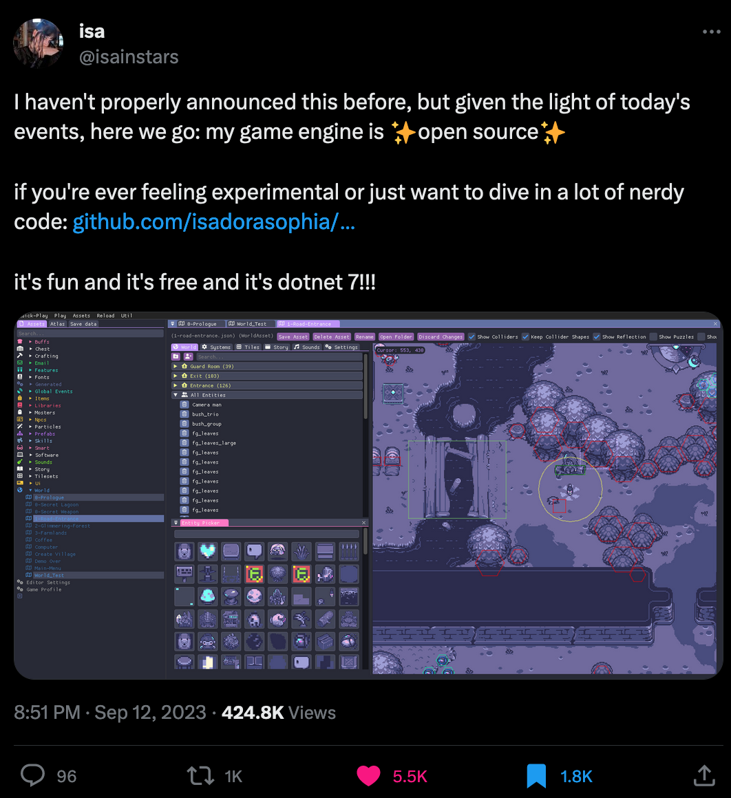 It's built on top of MonoGame, a framework for creating cross-platform games. If you're planning to build your next pixel art video game, you might want to check it out. Here's a link to the Github repo: