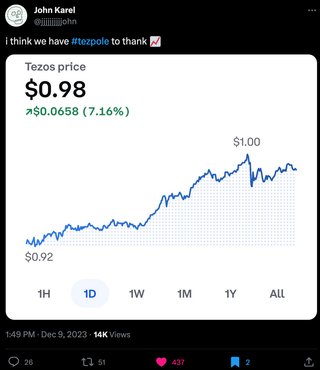 It seems that this also had an effect on the value of Tezos overall, breaking the 1$ mark for the first time in a while: