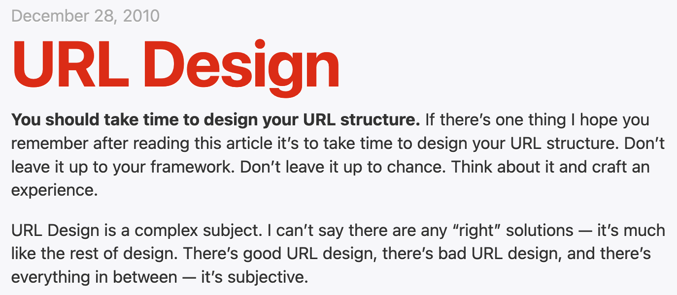 Did you know that URL design is a thing? Yes it is. If you've ever tried to do a little SEO optimization, you'll know how important URLs are, not just for linking back towards your website, but also for the purpose of conveying information to users and machines alike. Jim Nielsen lists a number of websites that have well crafted URL structures or have a creative take on it: