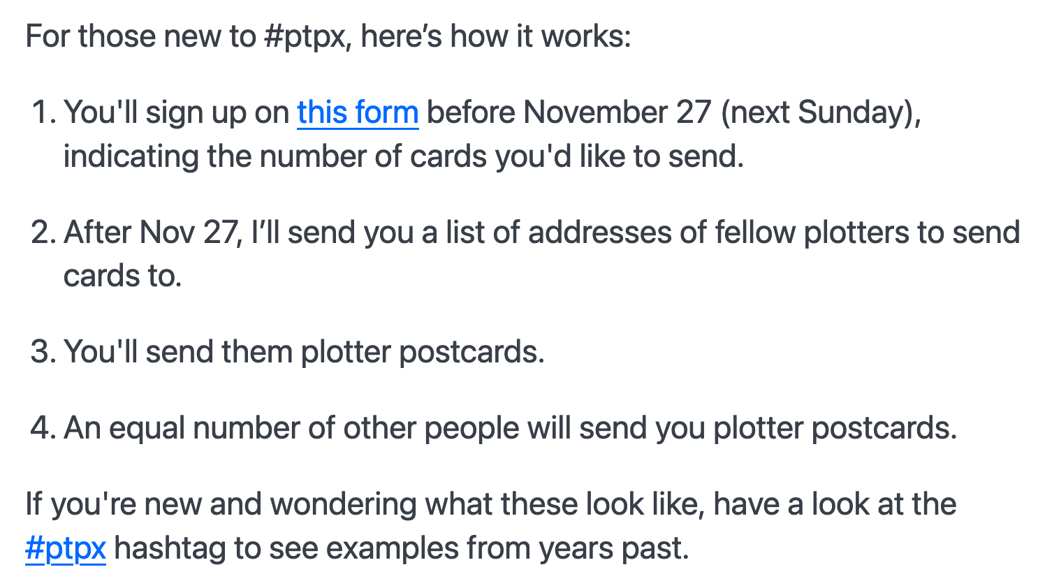 Although sign-up for this year is already closed here's a brief break-down of how it works - via a google form you indicate how many postcards you'd like to send out and will then be matched accordingly with others, whom you'll exchange postcards with - a breakdown of this from one of the previous signup pages: