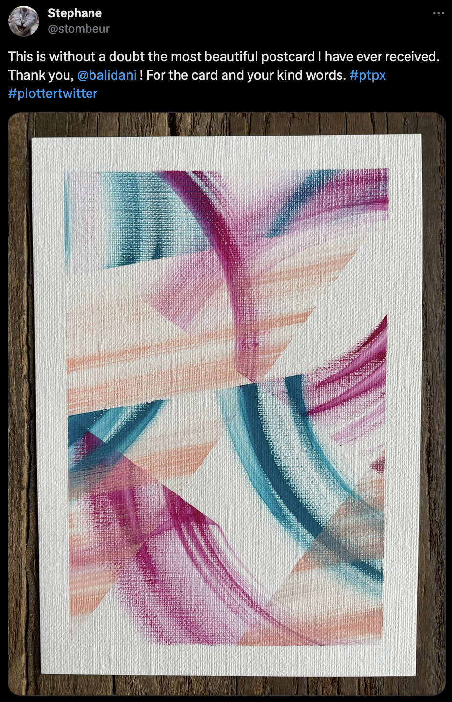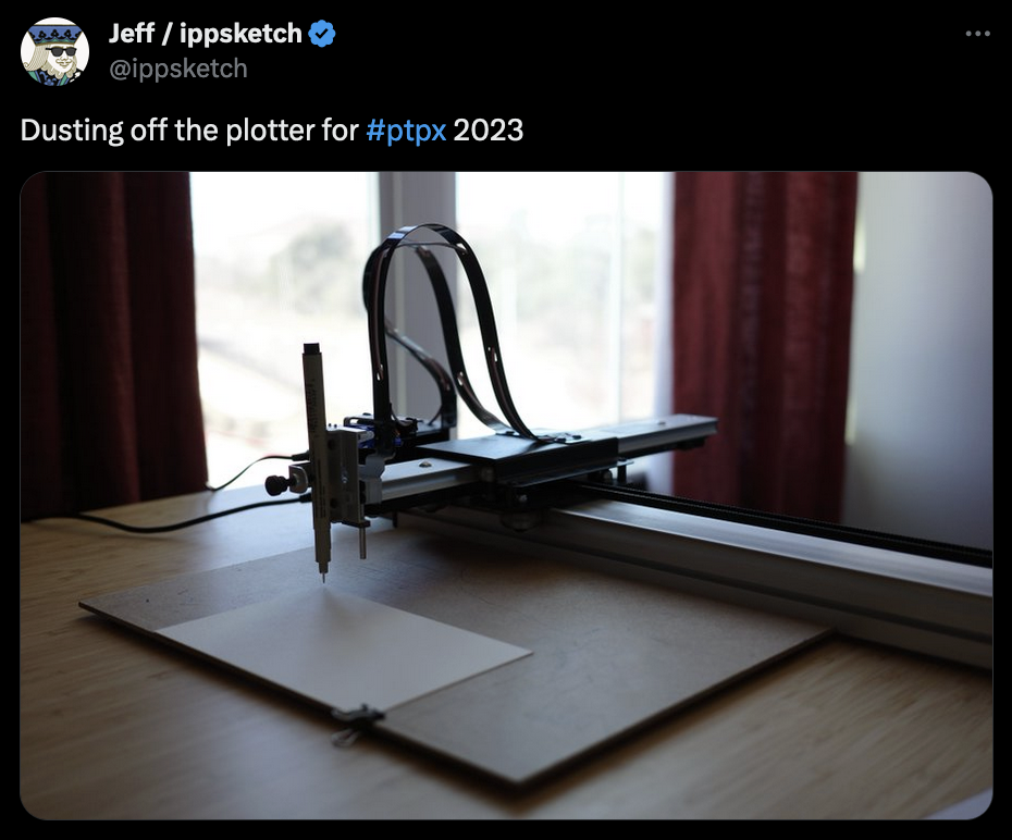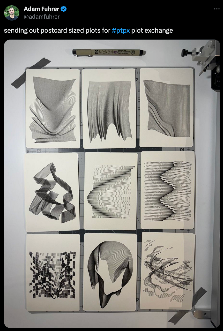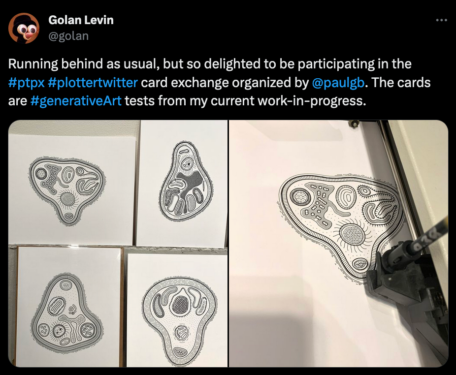 Over the weekend I suddenly came across a bunch of tweets tagged with #ptpx. Upon closer inspection, it turns out to be an annual event organized by Paul Butler, in which a number of plotter enthusiasts all across the world come together for an exchange of plotter artworks in postcard format: