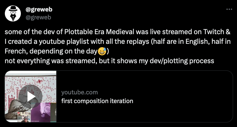 What's more, is that greweb also occasionally streams his dev process on Twitch, albeit sometimes in french it makes for a great educative resource if you're looking to get into plotting - what a lot might not know is that greweb actually has aphantasia which makes things doubly impressive: