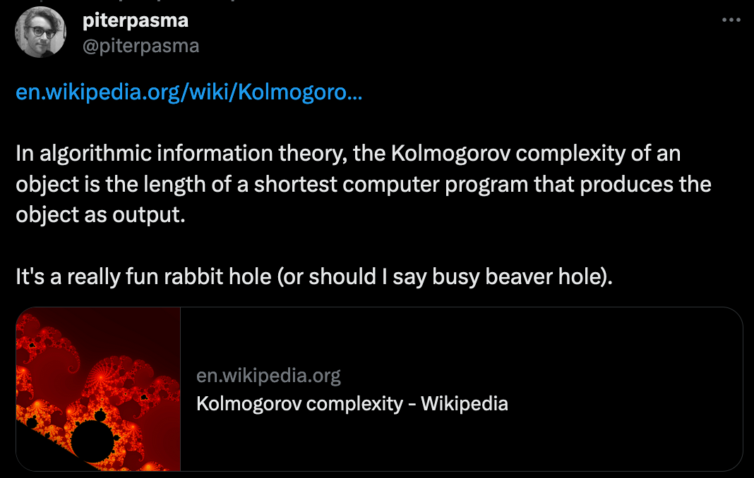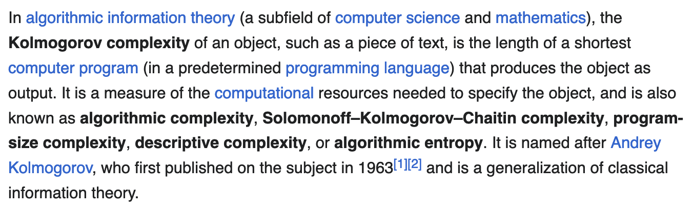 Hey also brings up the interesting notion of Kolmogorov complexity, which measures the complexity of objects by the length of the shortest computer program that produces the object as output: