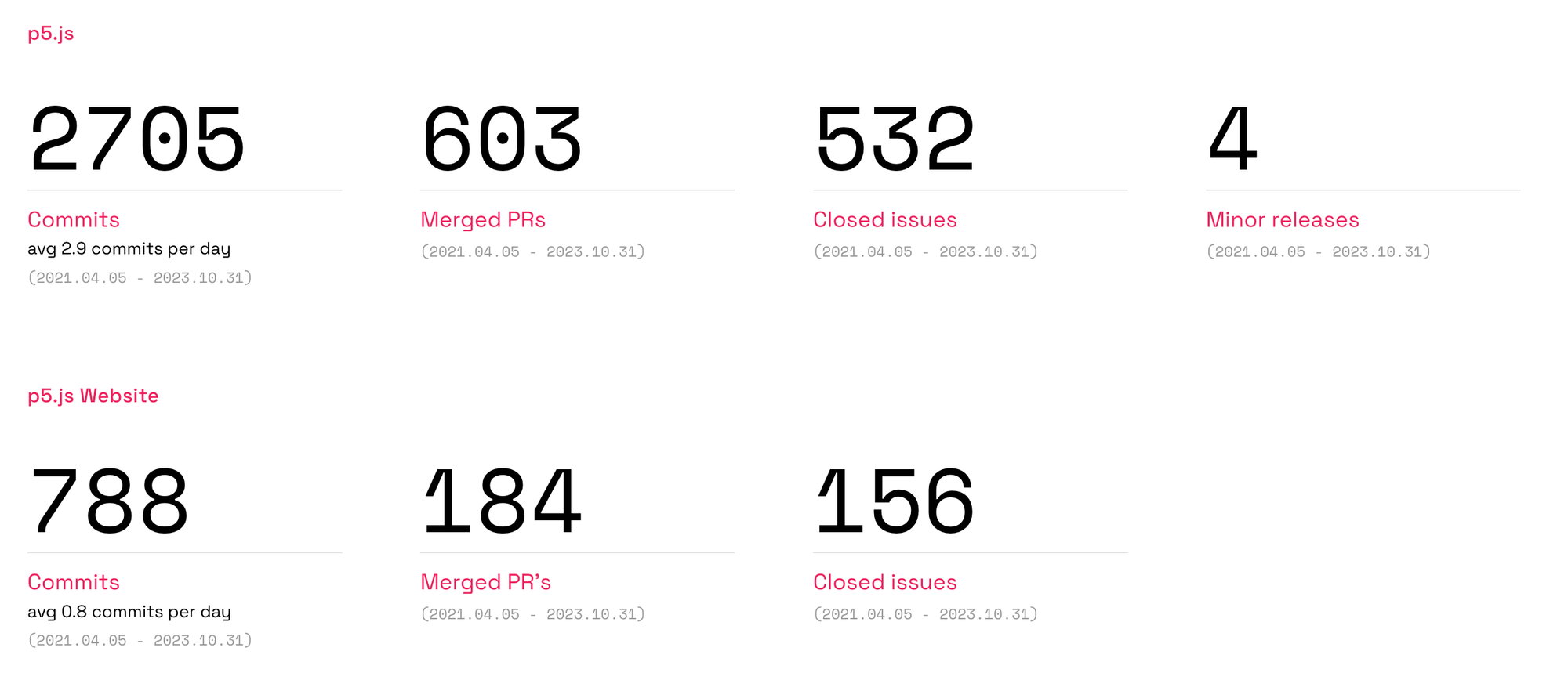 The report also shows some impressive numbers when it comes to the development of P5, which I believe to be much popular nowadays than the original Processing - especially with the commercialization of generative art via blockchain technology that demands for browser based code art - so there's definitely been progress on the development side of things: