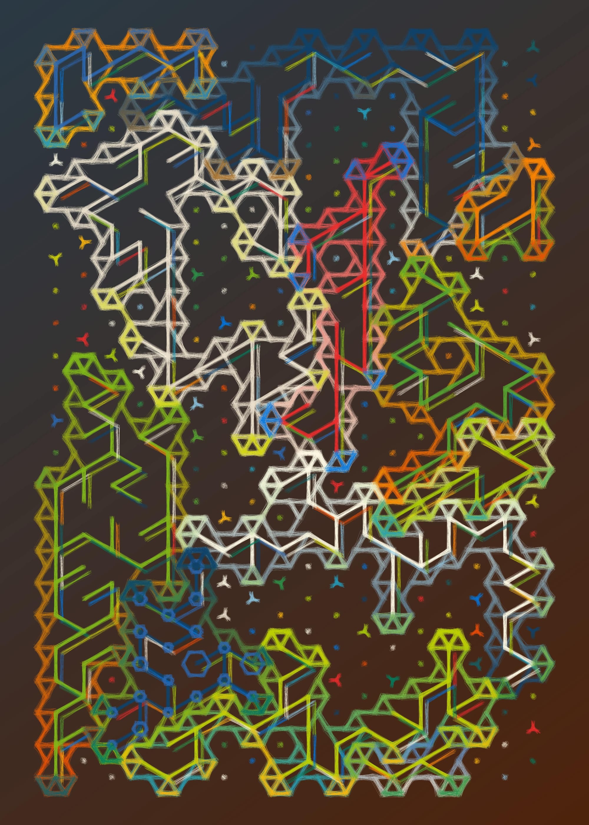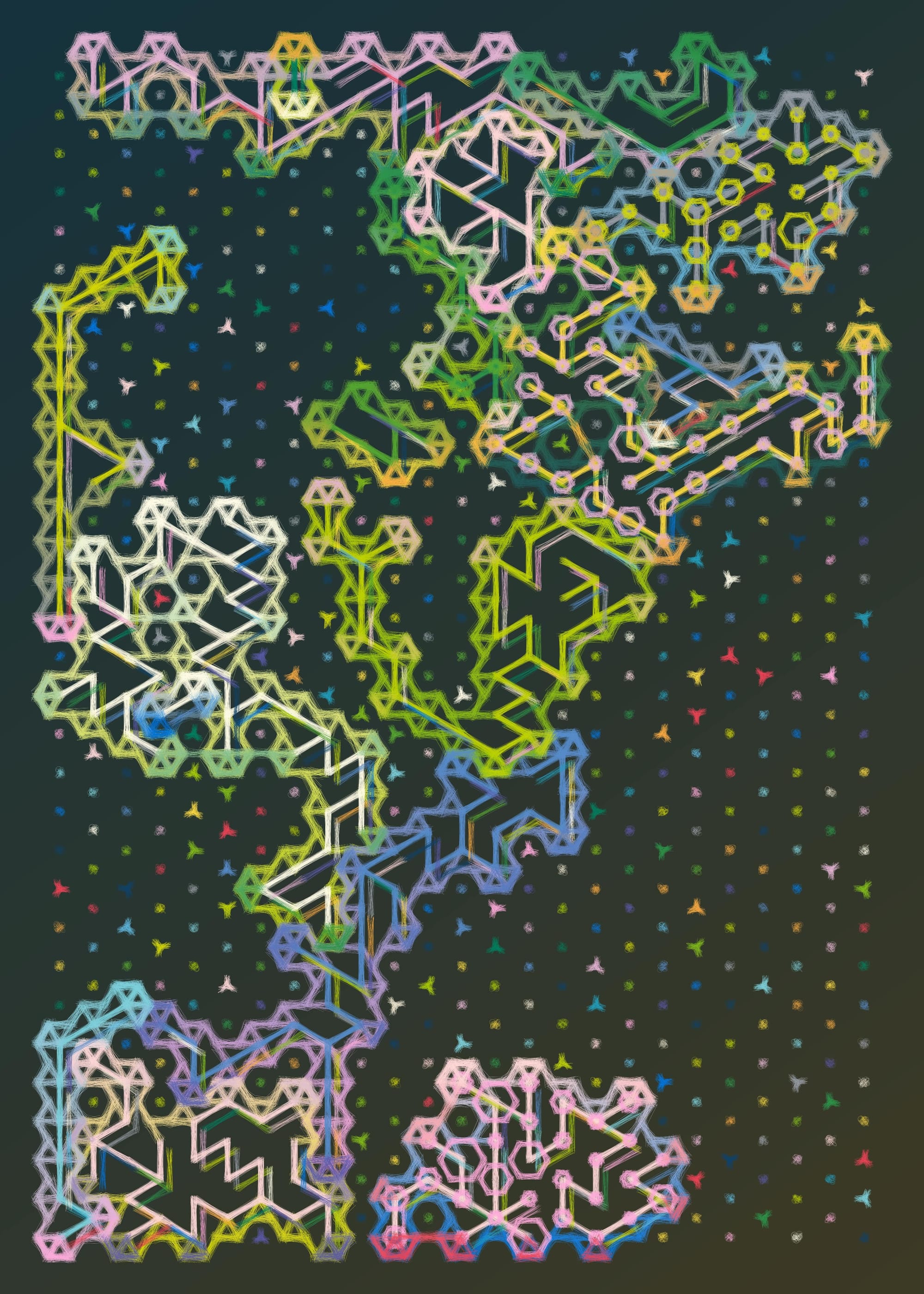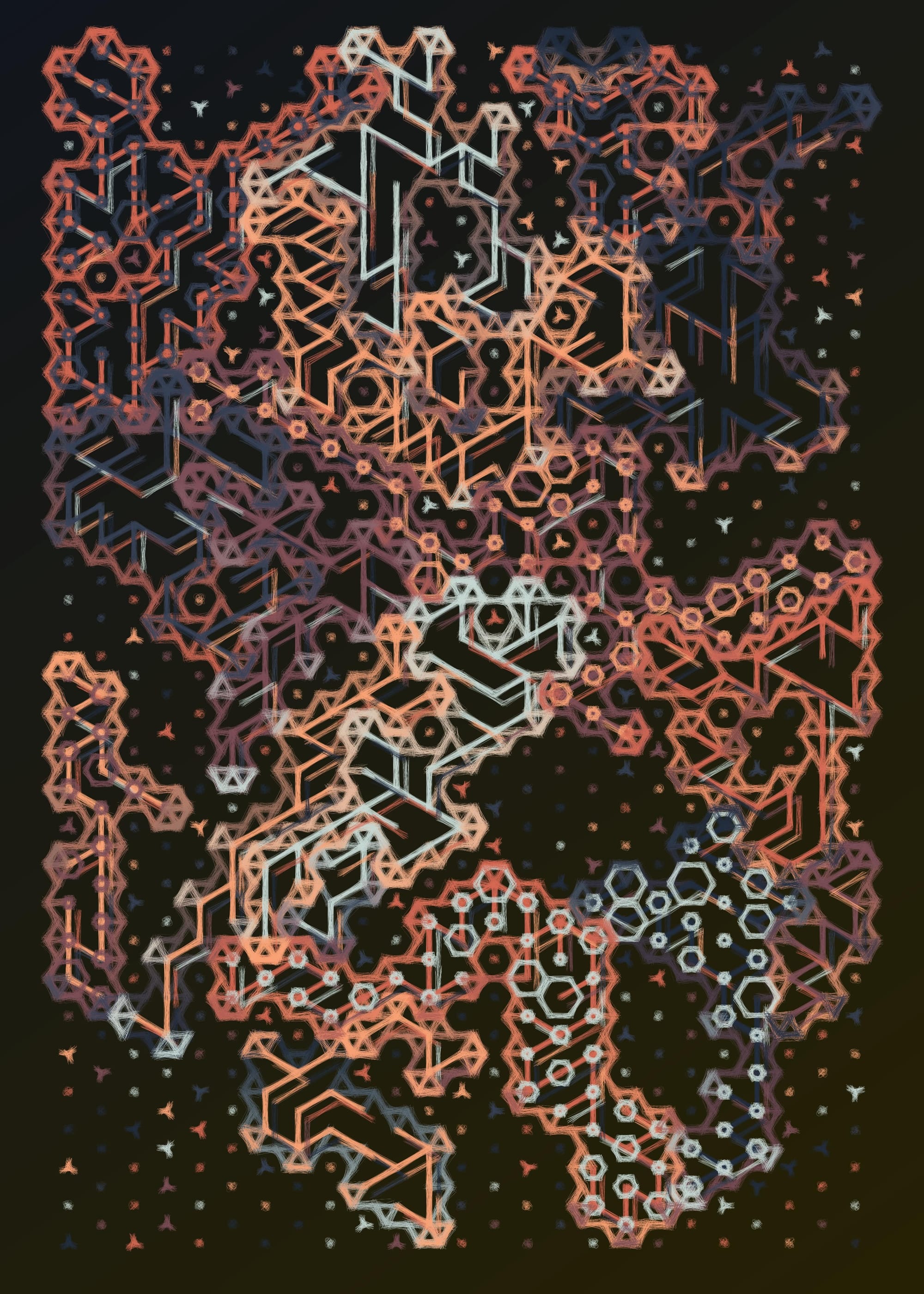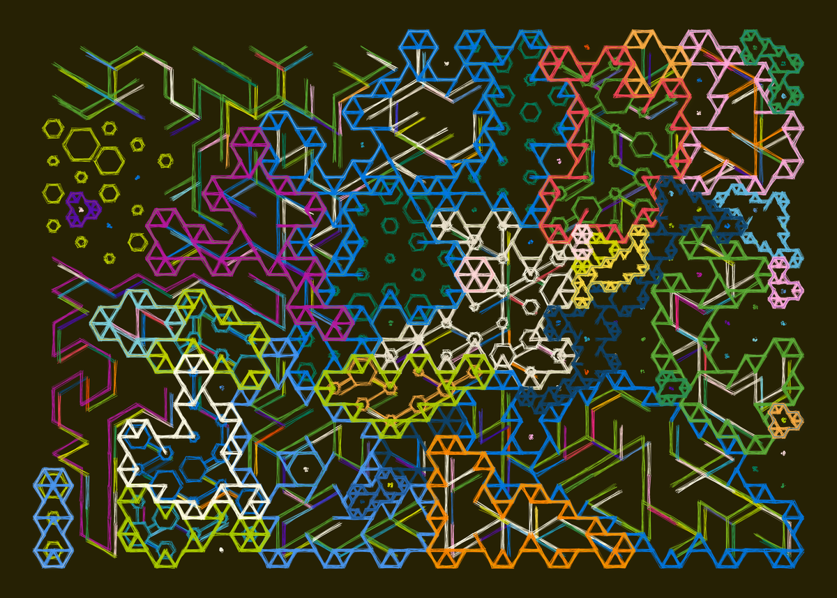 This time around I didn't let impostor syndrome get to me, even though it tried really hard. The code for this is a big amalgamation of different algorithms and methods, ranging from the construction and indexing of hexagonal lattices as connected graphs, all the way to graph traversal and polygon contouring algorithms. There were a couple of tough points throughout, but I powered through, reminding myself that I don't necessarily need to find a solution to NP hard graph traversal problems when I'm trying to make art. I'll probably make a "making of" style post about it over on the blog over the Christmas days. Here's a couple of sample outputs - I'm really happy with the compositions and the textures: