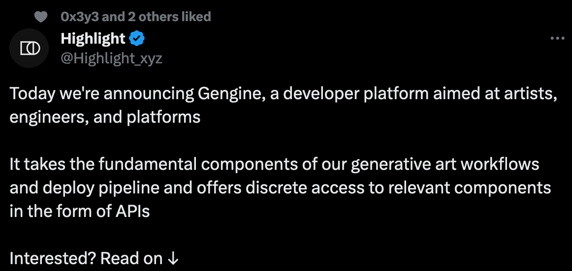A few days ago Highlight announced a private beta for a new developer platform called Gengine, that aims at greatly extending artists' capabilities in customizing their generative systems minted on Highlight: