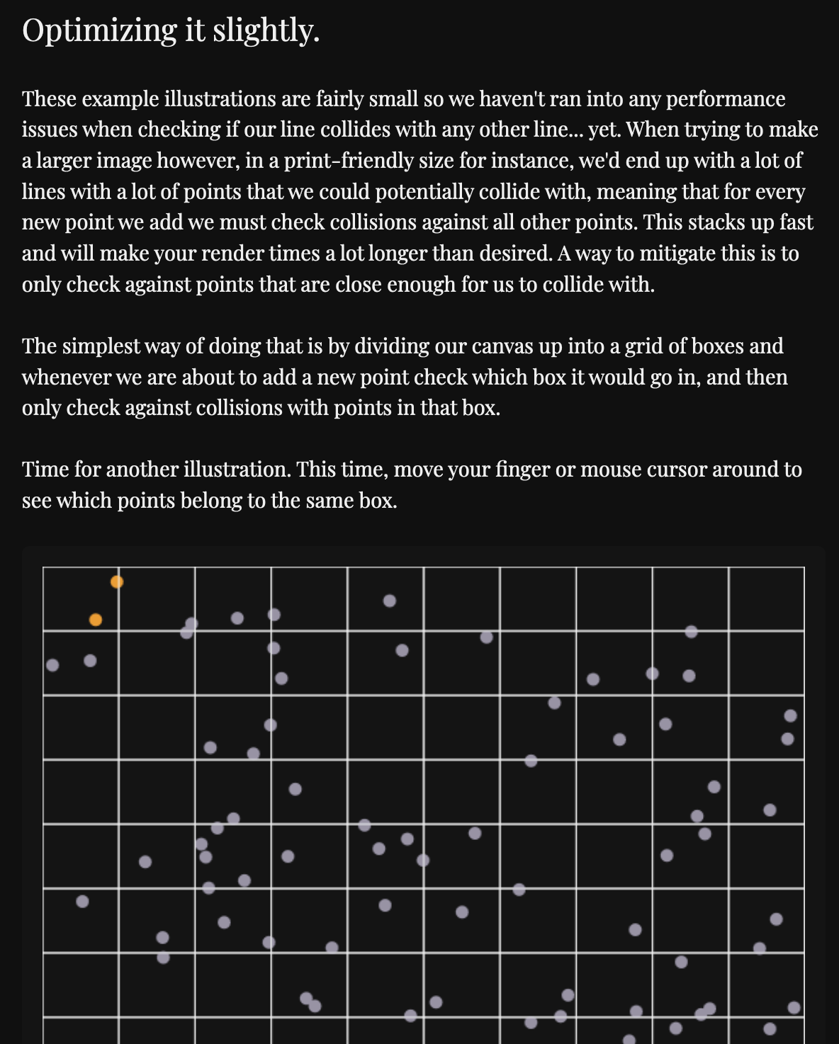 As the title might've already given away, the secret ingredient are flow fields. After providing a break down and explanation of the involved concepts that allow for the creation of these flow fields, Rashidi proceeds to explain how they can be used as an underlying structure for guiding the squiggly lines as we see them in Fidenza.