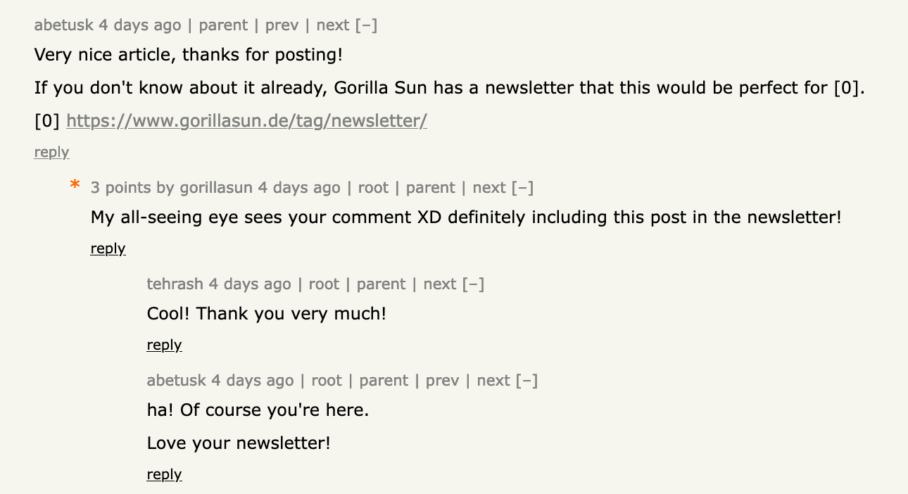 And just a btw here, I came across this article when I noticed that I was getting some newsletter signups over from Hackernews - a quick "Hackernews Gorilla Sun" search led me to Damoon's post under which abetusk had kindly given me a shoutout: