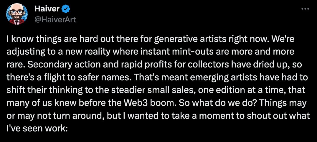 Having curated an impressive number of projects with Dawn Contemporary, Haiver has some of the best insights when it comes to artists trying to make a living from generative art - in a long-form tweet of his, he provides us with some of his thoughts about how the market has changed over the past three years and gives some words of advice on how artists can adjust: