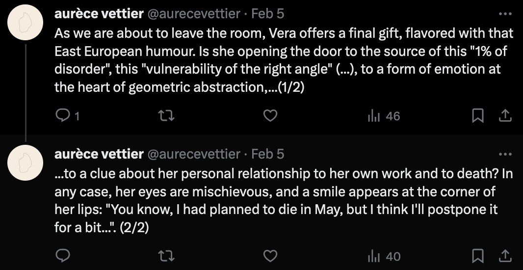 In light of the exhibition, Aurèce Vettier was asked by the centre Pompidou to reflect on his collaboration with Vera back in 2023. He wrote a beautiful article in which she pays tribute to the Grande Dame, describing how she never lost her passion for making art even with old age:
