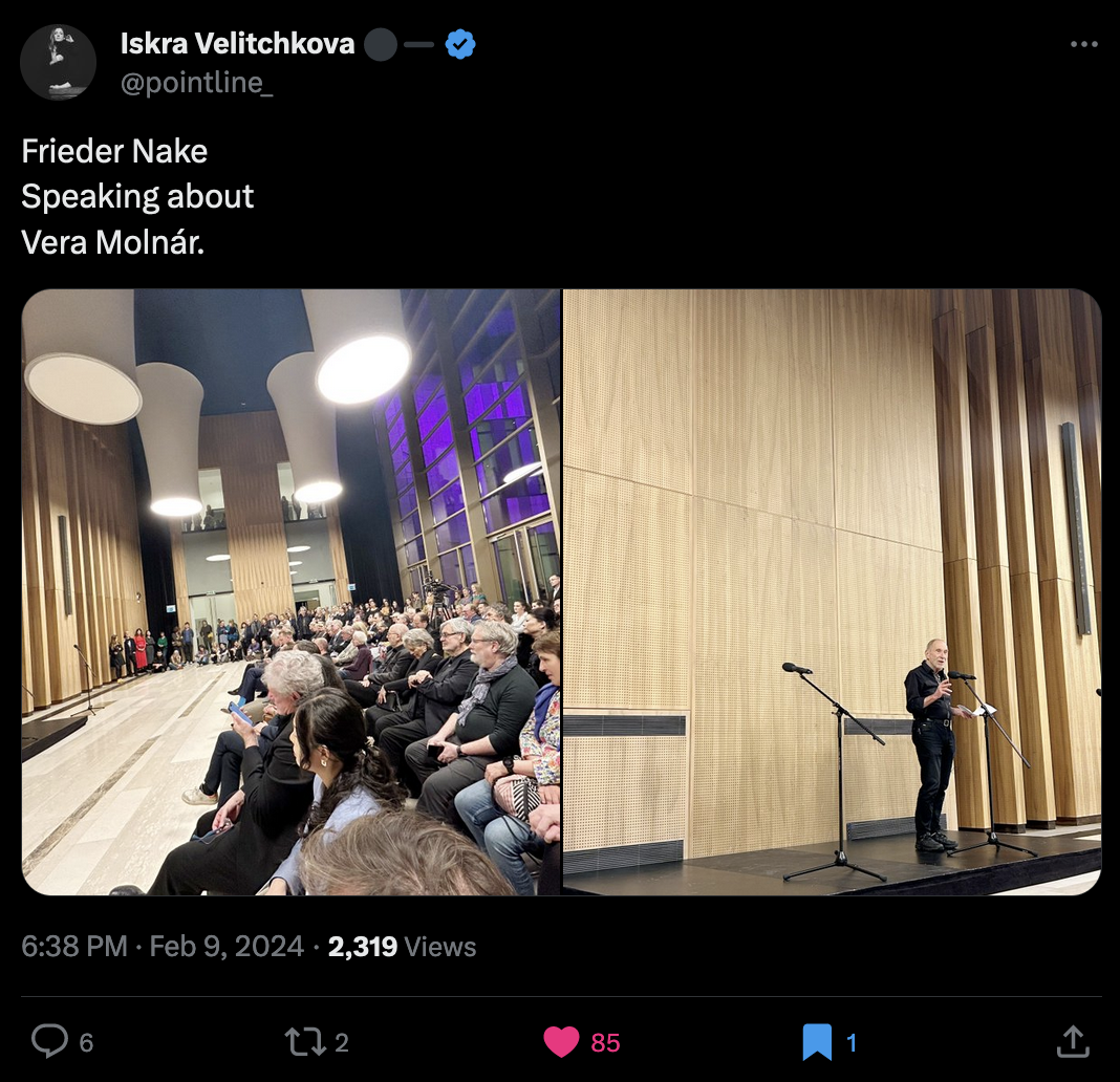 A highlight of the exhibition's opening ceremony, was a talk given by Frieder Nake, another one of the generative art OGs. From what I see in the picture, it's remarkable how many people came together to celebrate Vera Molnár that day: