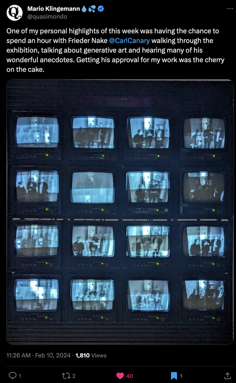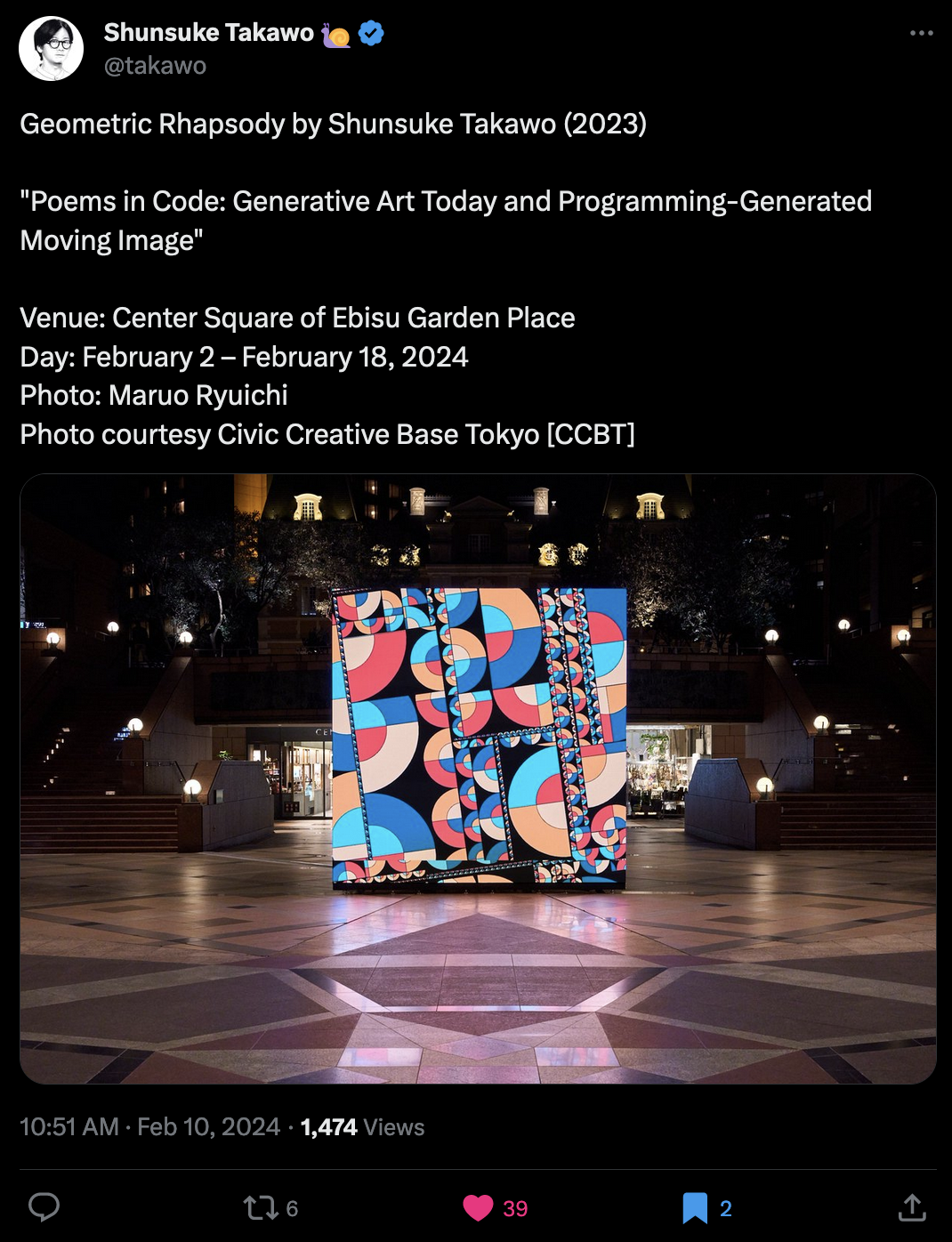 It seems that everyone's properly recovered from Genuary 2024, and that a whole slew of generative art exhibitions are afoot around the globe - from Budapest to London, and all the way to Japan 🌎