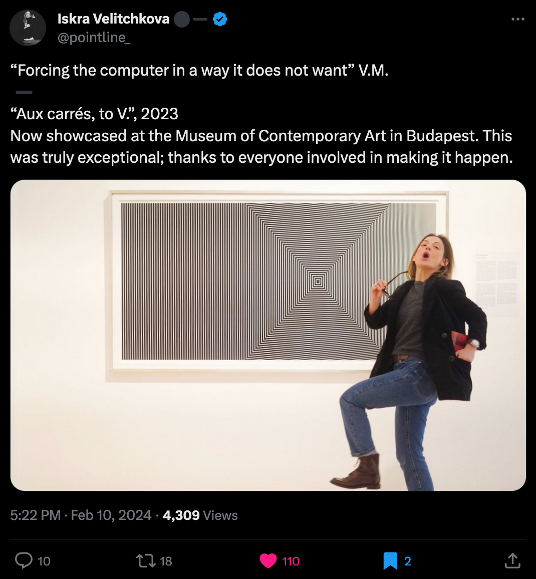 Vera Molnár passed away early December of 2023, just a month prior to what would have been her 100th birthday - she lives on however, not only through her art, but also through the new generation of generative artists for many of which she is still a big inspiration. Just two days ago on the 10th of February, the exhibition À la recherche de Vera Molnár kicked off at the Ludwig Museum for Contemporary Art in Budapest to celebrate her life's work: