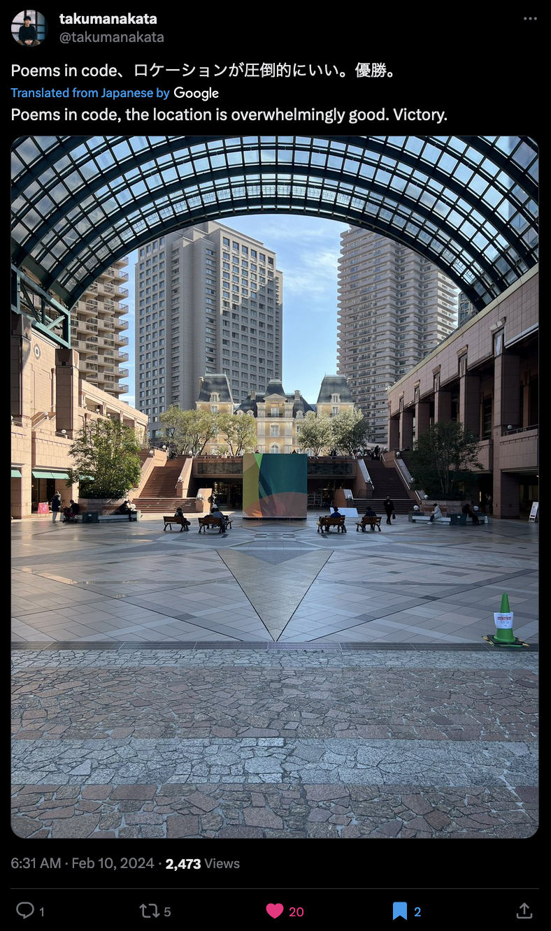 Poems in Code is a beautiful single screen exhibit set up in the middle of Ebisu square, a big open space located in the heart of Tokyo: