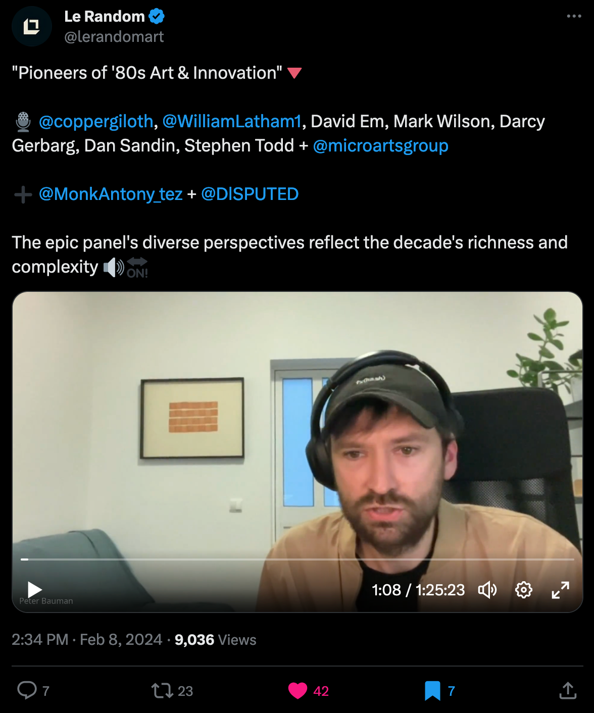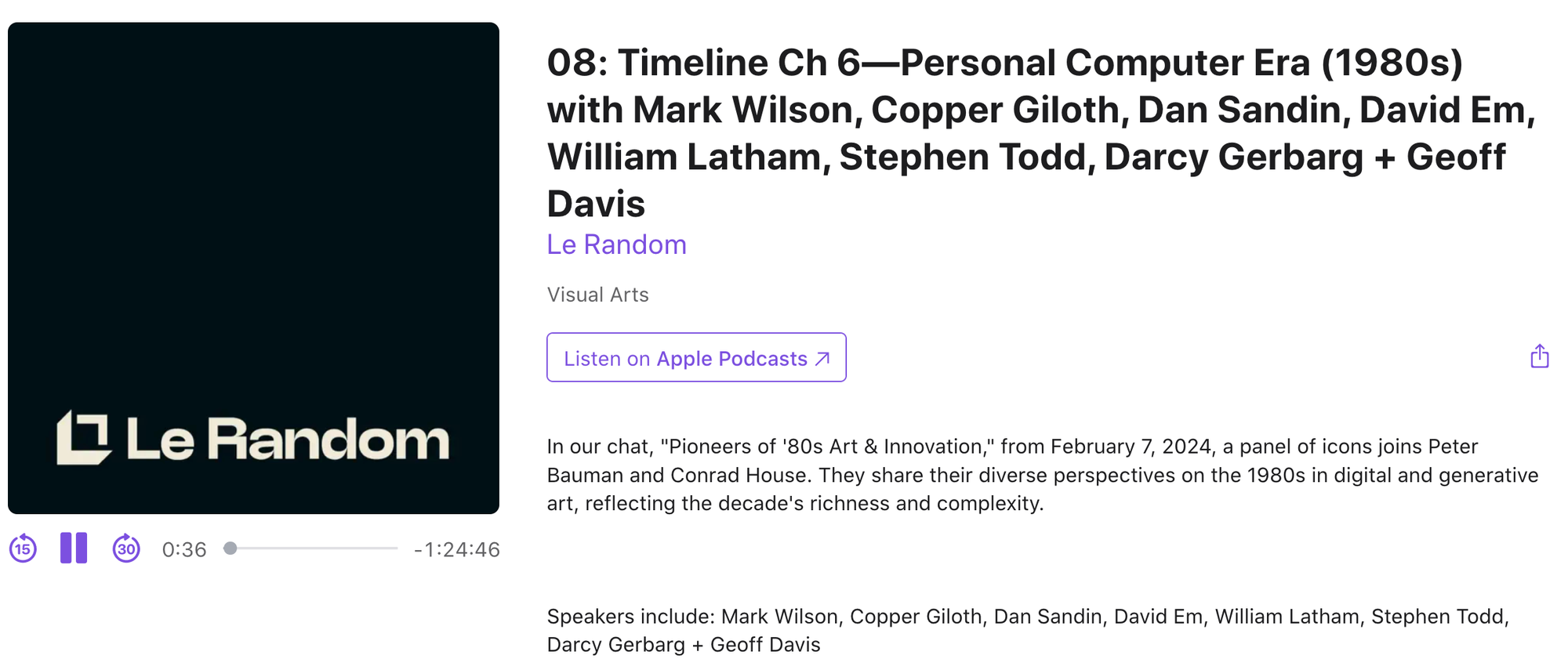 Le Random has been going strong in the past weeks, not only consistently expanding their timeline, but also putting their best foot forward in terms of Twitter spaces and publishing the recordings in podcast format. In the most recent talk they invited 9 of the pioneers that were at forefront of generative art in the 80s, letting them present their stories and reflecting with them on the practice at that point in time: