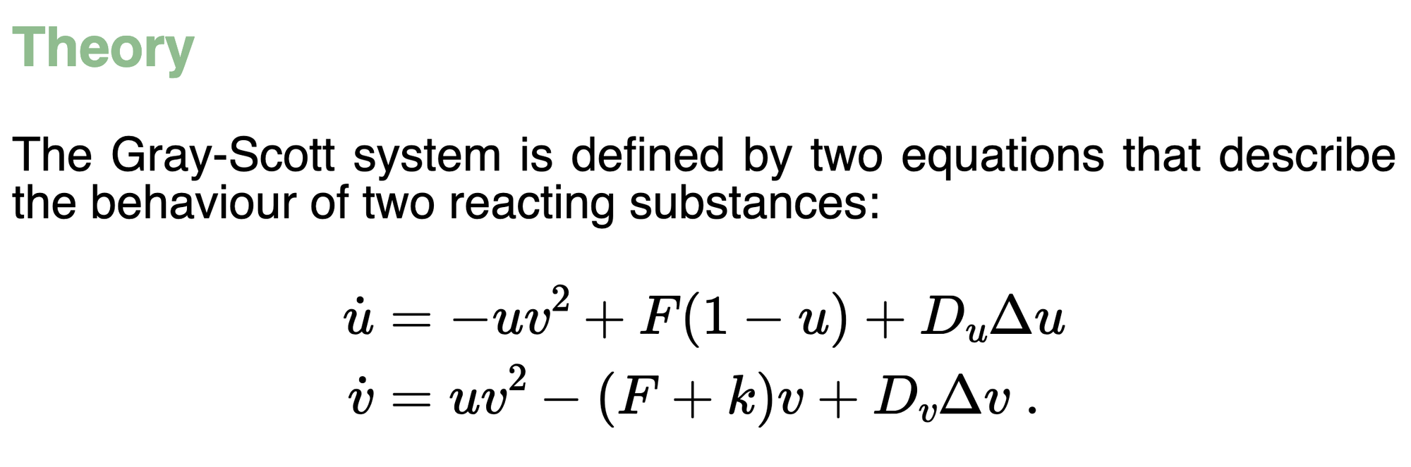 The most popular way to implement a Reaction Diffusion system is via the Gray-Scott model, that basically postulates of a set of two equations which simulate the interaction of the two chemicals at any given pixel and how this concentration should evolve over time:
