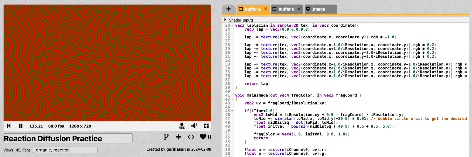 I've also been up to some shenanigans of my own. In the first half of this week I explored Reaction Diffusion again after roughly two years of having first encountered it. I think I have acquired a much better understanding of it now, and how to actually get some nice looking patterns out of it. Here's a little demo of what I ended up making: