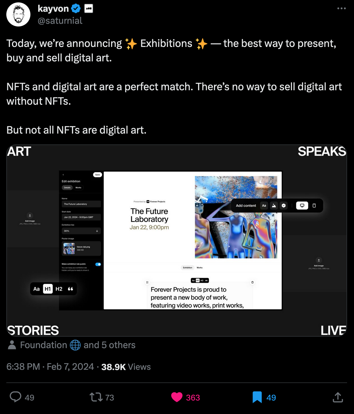 And while we're talking about Art, NFTs and the market, just a couple of days ago, Foundation announced a new feature that's coming to their platform, with the self-explanatory title "Exhibitions":