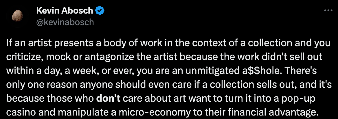 With the advent of long-form generative art and the underlying blockchain technology that makes it possible, selling out fast has become one of those hot topics that's established itself as an important factor in determining the value of a collection - one of the points that Haiver tackles in his tweet. Recently however, it's been less and less the case that projects sell out instantly.