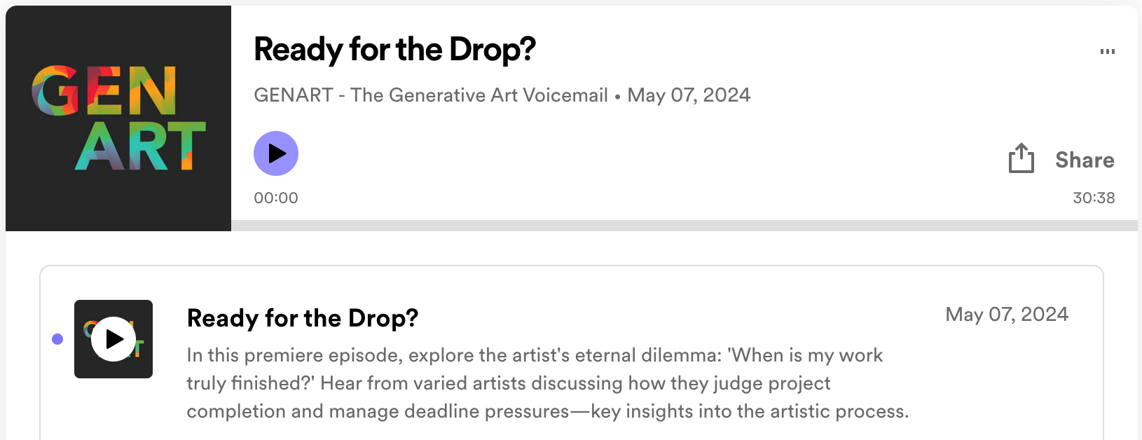 Arguably the most important piece of content in the genart space from last week was Camille Roux's new genart podcast. It made quite the splash due to its innovative format: instead of taking the common approach and inviting one or two guests to record a conversation as it is unfolding - Camille chose to do it a little differently, extending an open invitation for other generative artists to record their spoken answers in reply to a question of his. The podcast is then presented as a collage of these voice messages. You can listen to it here: