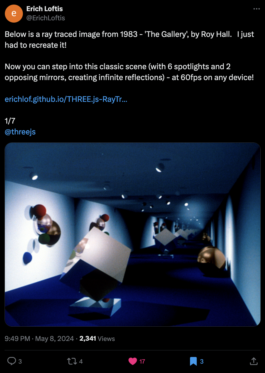 Fascinated by Roy Hall's 1983 ray-traced artwork The Gallery, Erich Loftis decided to recreate it with threejs. In a thread he tells us about the details of his implementation: