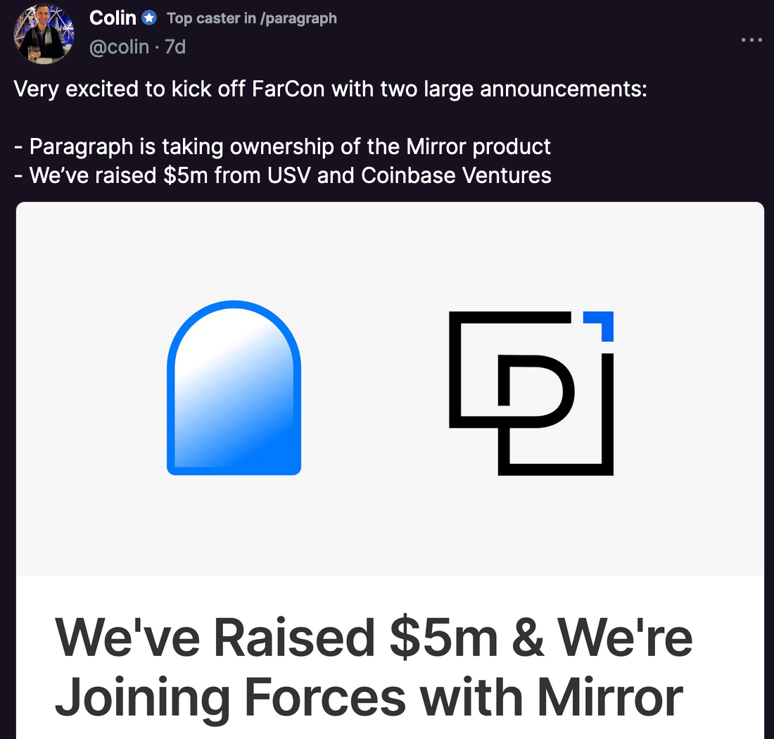 I think I've mentioned it before, but paragraph is essentially a Web3 Substack alternative. I've been quite out of touch with what's been happening with FarCon, but there's been an exciting development regarding paragraph as it's taking over Mirror - which is in essence a very similar platform to paragraph that allows writers to publish their content in a decentralized manner: